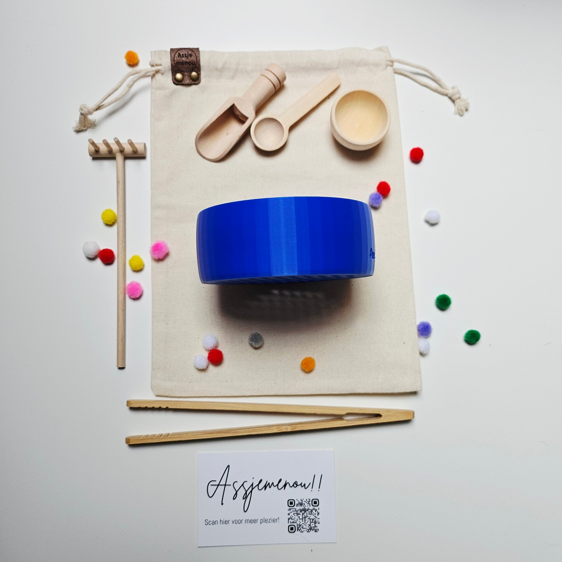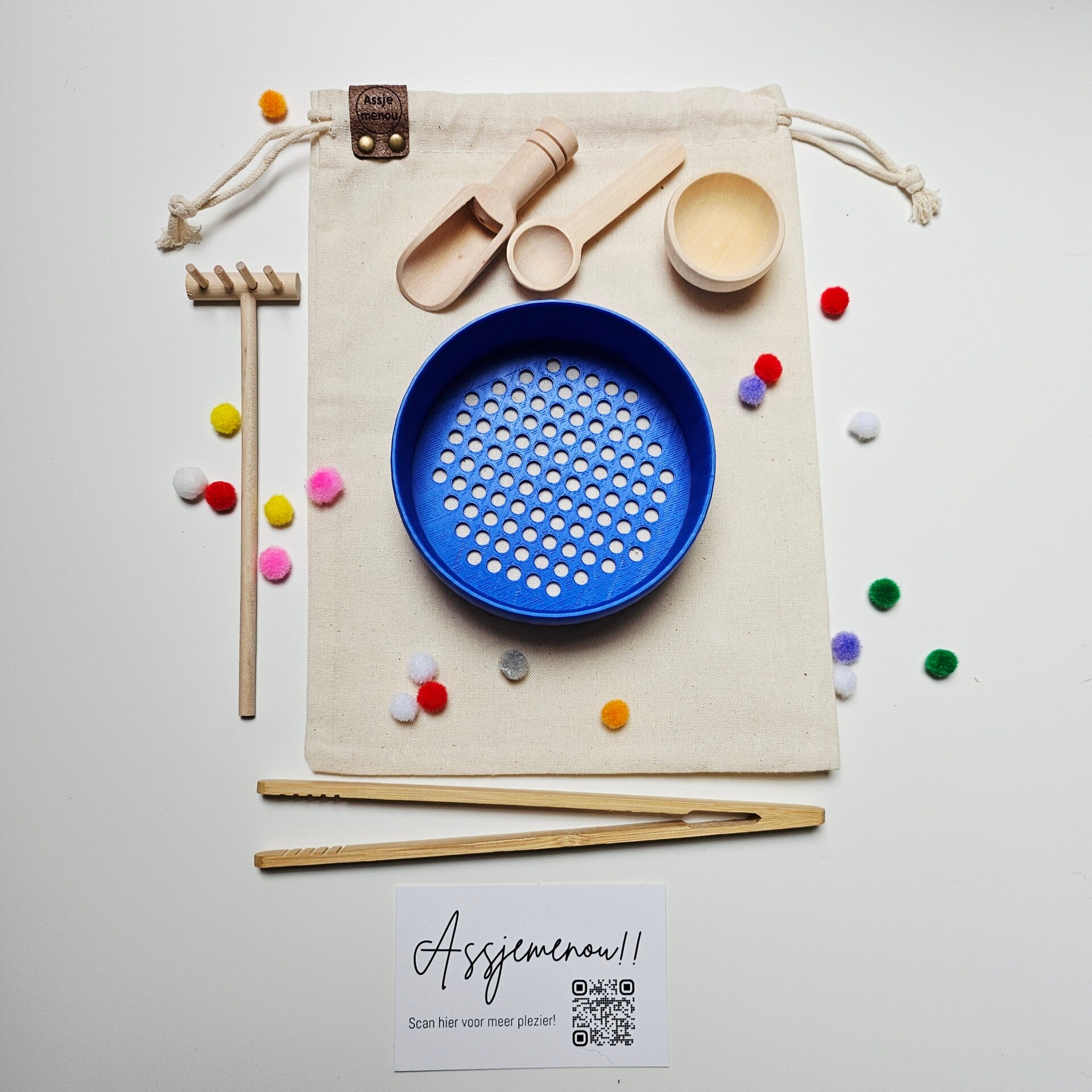 De zeefjes komen in een linnen zakje met 350gr Speelrijst en pompoms en toolsetje