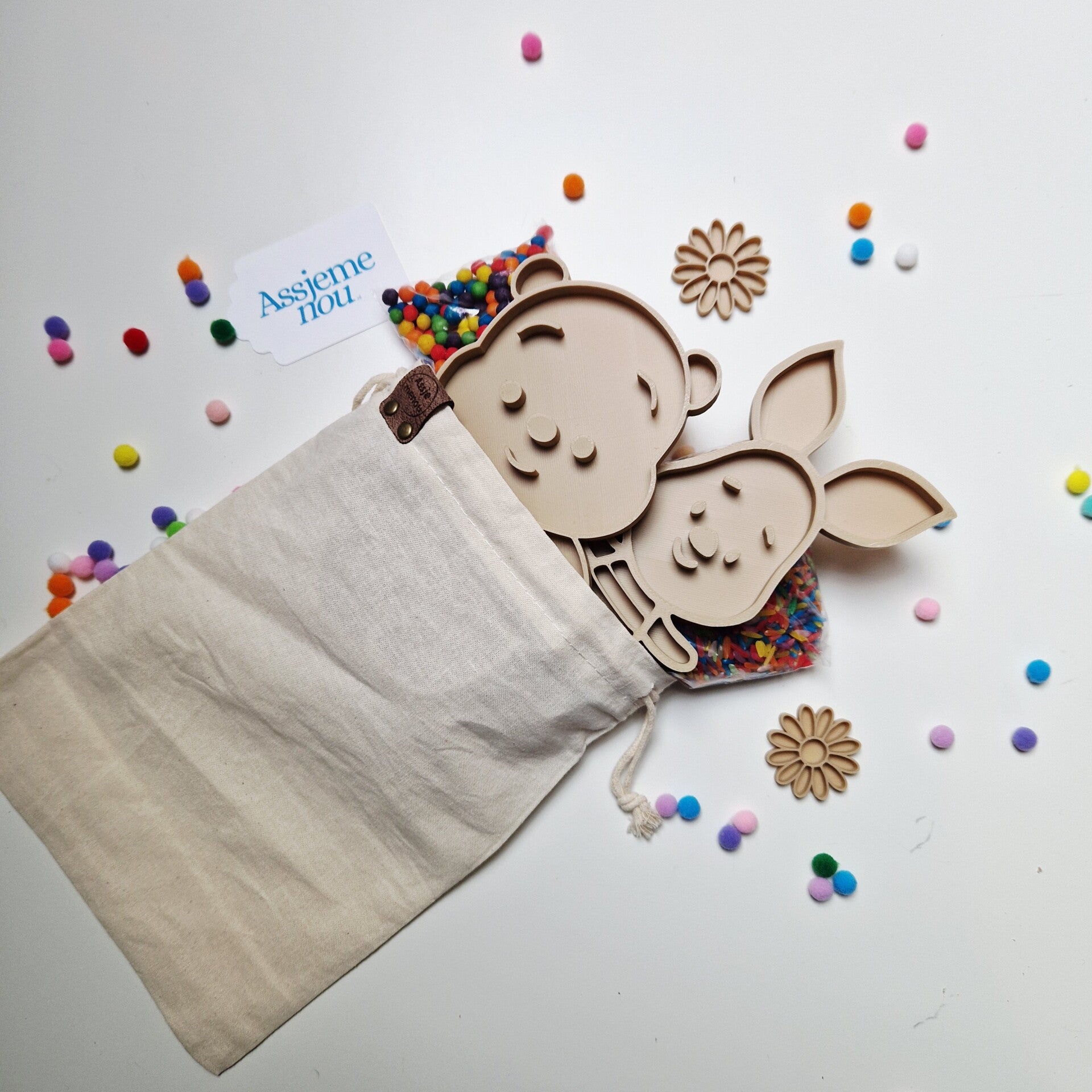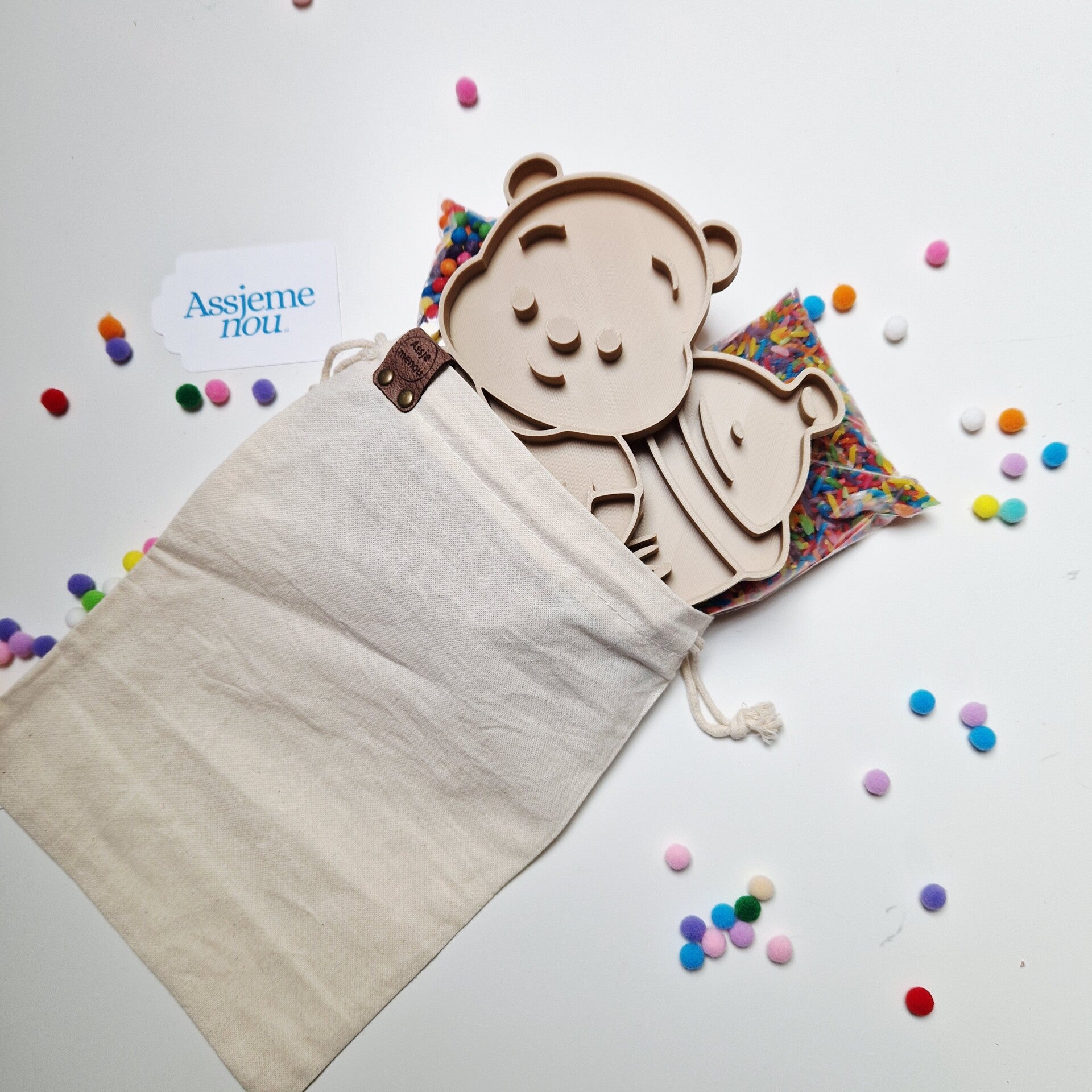 Laat je kindje ontdekken, voelen en creëren met onze kleurrijke speelrijst en schattige Honey Bear vulvorm. 🌈