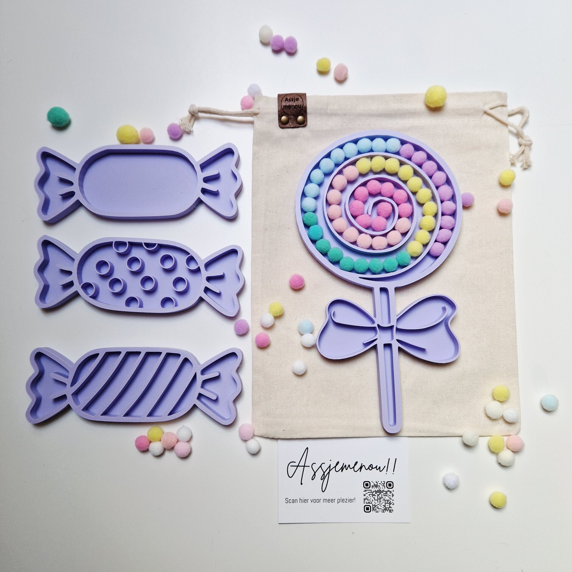 - 1 grote lolly vorm met pompoms en 3 kleinere snoep vormen