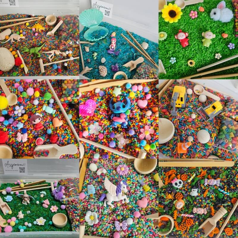Onze sensorische speelrijst is gemaakt om kinderen urenlang spelplezier te geven. Ze kunnen scheppen, gieten, sorteren en rollenspellen spelen. Dit speelgoed bevordert creatief spel, motorische ontwikkeling en spelenderwijs leren.